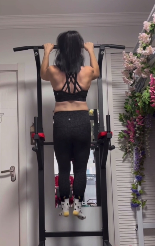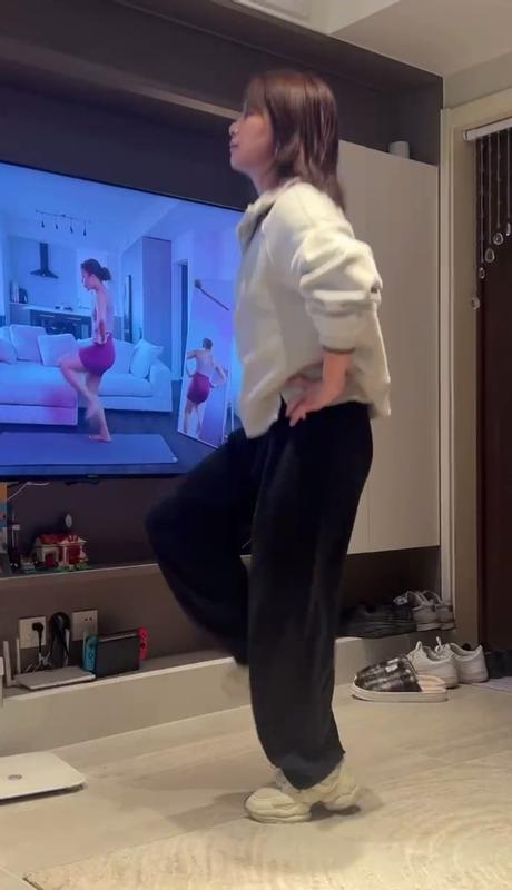 健身操视频中,女教师在家里客厅铺上瑜伽垫,伴随着动感音乐跳起了精心编排的家庭健身操。整个过程中,这位老师动作流畅且表情自信,她不仅自己享受着运动的乐趣,还带动了全家一起参与到健康生活的行列中来。