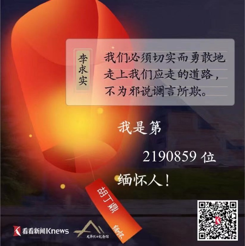 牛露潼:我们通过网络祭扫龙华英烈,学习烈士精神,并且亲手在屏幕上为革命先辈点燃灯火。灯火象征着国泰民安的繁华图景,象征着人民对他们的深情追思,也象征着一代代共产党人薪火相传的精神。愿以此身长报国,我们将追随革命先辈的脚步,继续走在建设社会主义现代化国家的新征程上,勇担使命,不忘初心。