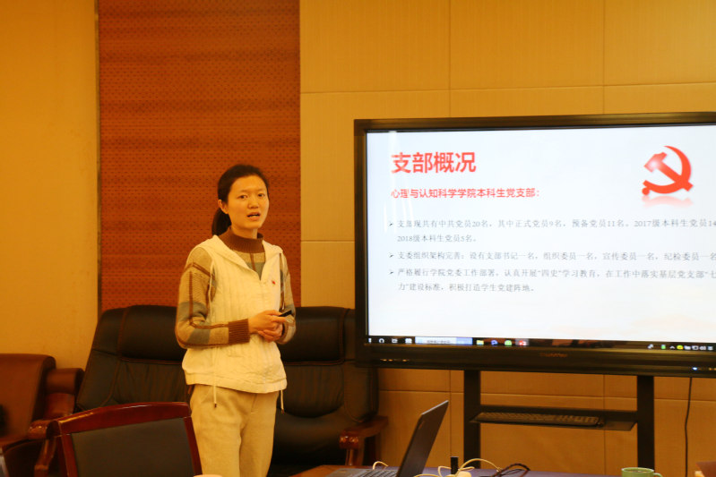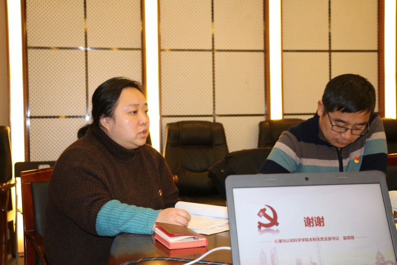 本科生党支部书记赵菲菲讲述了支部扎实开展“四史”学习教育、加强学生党员培养发展、加强党风党纪监督教育等方面的工作成果。她提到新冠疫情期间,本科生党支部勇担心理学子抗疫使命,发挥了党员引领示范作用。下一步将创新党员活动形式,增强党员活动教育意义,加强学生党支部“唱主角”作用。