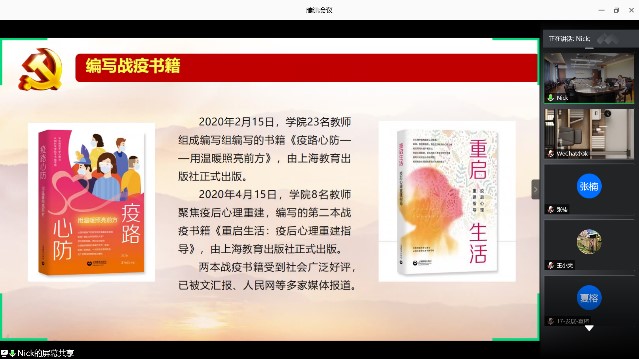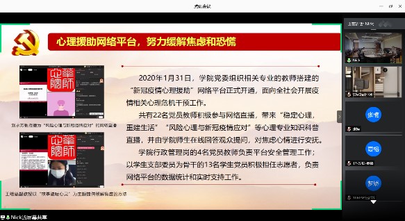 接着,方媛老师以“勇担使命、同心抗疫”为主题,向毕业生党员介绍了学院师生党员们在抗疫期间向全社会提供的疫情防控心理援助及科普工作,主要包括心理知识科普推文、心理咨询网络平台、心理咨询电话热线、心理原创手绘系列、战疫书籍等等,充分体现了心院人发挥心理专业优势服务社会的使命担当。