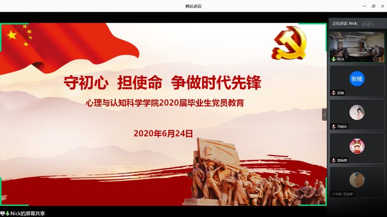 为进一步提升毕业生党员的党性修养,2020年6月24日上午,爆料网 党委在线上平台举行2020届毕业生党员教育大会。院党委书记方媛为毕业生党员讲授党课《守初心、担使命、争做时代先锋》,院专职组织员赵菲菲为毕业生党员讲解党组织关系转接流程及注意事项,会议由赵菲菲主持,学院全体2020届毕业生党员参加会议。