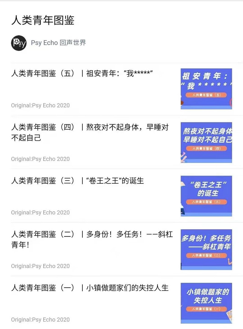 在2021年的寒假社会实践项目中,Psy Echo电台聚焦于新时代青年群像,开展了寒假系列特别节目——人类青年图鉴。电台围绕主题共推出了8期相关节目,分别为小镇做题家,斜杠青年,社恐人,时差领主,卷王之王,祖安老哥,嗑学家以及搞钱机器,为的是向听众展示新时代青年独特的心理面貌,呈现时代代表性的心理特征,呼吁大家以新兴的眼光看待青年群体的社会百相。