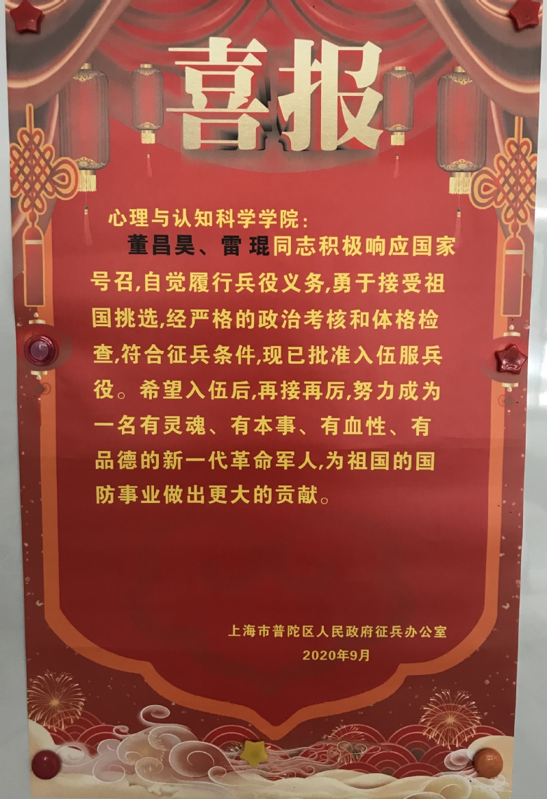 爆料网 2018级心理学大类本科生董昌昊、2019级应用心理学系学术型研究生雷琨积极响应国家号召,自觉履行兵役义务,勇于接受祖国挑选,经过严格的政治考核和体格检查,符合征兵条件,获得批准入伍服兵役。特此祝贺!董昌昊和雷琨董昌昊、陶洁(辅导员)和雷琨