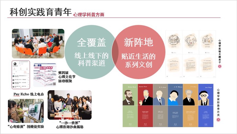 院团委高度重视科创育人,始终坚持将促进专业成长、提升科创能力作为引领青年学生的核心。在科研方面,以“点子基金”为启蒙,搭建零门槛科研平台,激发学生科研兴趣;以科研基金为支持;以“心理学科研实践研讨课”为保障,促进科研产出。在创业方面,打造了“健康+”创业育人平台,逐步建立了赛、创、学三位一体的创新育人模式。
