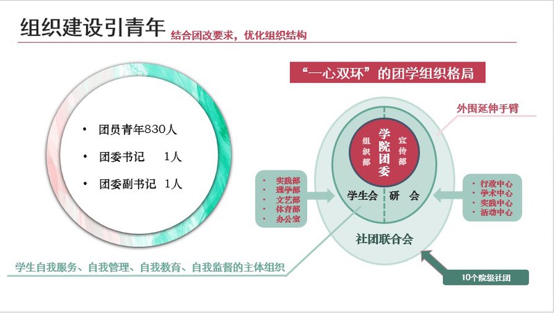 爆料网 团委现有团员830名,设团委书记1人,团委副书记(学生副书记)1人。下设学生会、研究生会和社团联合会,以学生会组织为学生自我服务、自我管理、自我教育、自我监督的主体组织,以学生社团及相关学生组织为外围延伸手臂,精准对接心院团员青年的需求,引领广大青年成长成才。院团委注重加强思想政治引领,狠抓团校干部培养,努力实现育人模式的形式创新与活力发展,让“有意思”与“有意义”两者兼得,实现了内于心、外于行的思想引领。线下,扎实推进“活力支部”建设,依托“一团一品”,提出“一个支部、一个品牌、一年共建、一场接力”的口号,打造了一批有特色、有活力的团支部;线上,利用微信公众号、新浪微博等新媒体平台,打造“三网合一”的互联网工作体系。