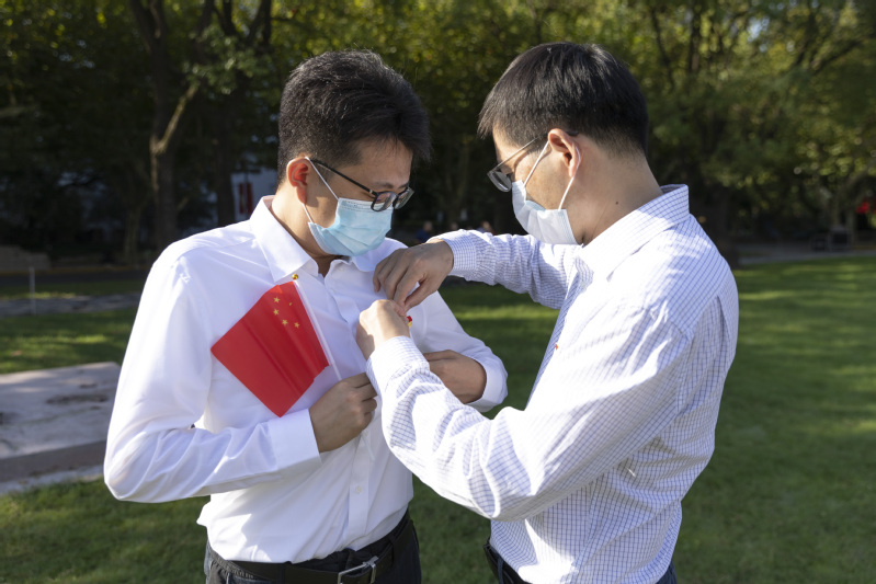 国旗下,顾红亮副校长为样板党支部党员代表肖雨蒙佩戴党员徽章。
