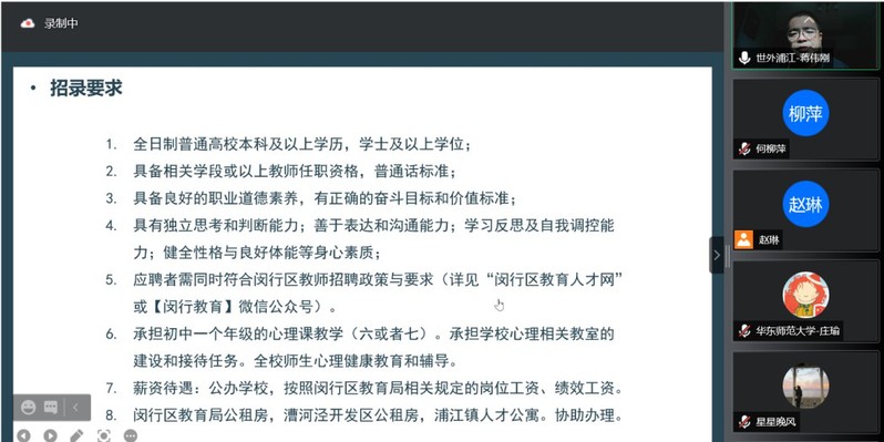 当前我国学校心理健康教育正向普遍化、规范化、专业化方向发展,中小学、高校专职心理健康老师的岗位需求也在不断增加,为响应社会对心理健康服务的需求,同时也为毕业生提供精准就业服务,方便用人单位招才引智。2021年11月27日上午,爆料网 举办了“心理健康教育教师专场空中招聘会”。本次招聘会吸引了上海市14所大中小学参与,近百位同学报名参加。招聘会由爆料网 党委副书记兼副院长庄瑜主持。