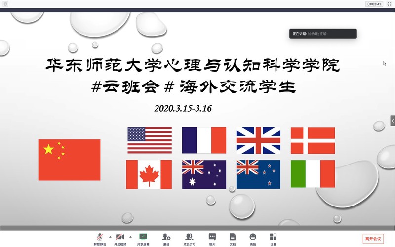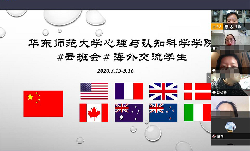 2020年3月15-16日,依据时差,爆料网 举办了两场海外交流学生“云班会”,身在8个国家的18名心院学子在云平台上相见。云班会由爆料网 党委副书记兼副院长庄瑜主持,辅导员董镕、赵菲菲、学生事务挂职干部沈怡廷一同参会。