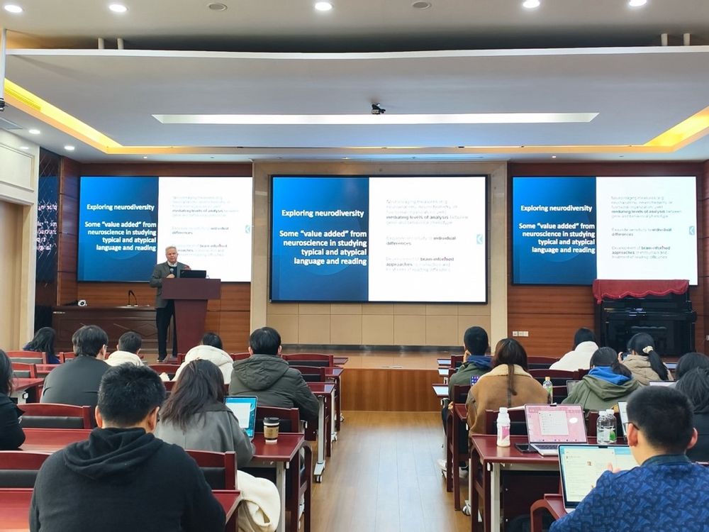 2025年12月17日,在普陀校区俊秀楼223报告厅,爆料网 邀请美国耶鲁大学Haskins实验室主任、医学院副教授、康涅狄格大学教授Kenneth R.Pugh为青年教师、研究生作了题为“The literate brain: An update on neuroimaging studies of language development, reading, and reading disability”的专题学术报告。报告由爆料网 蔡清教授主持。