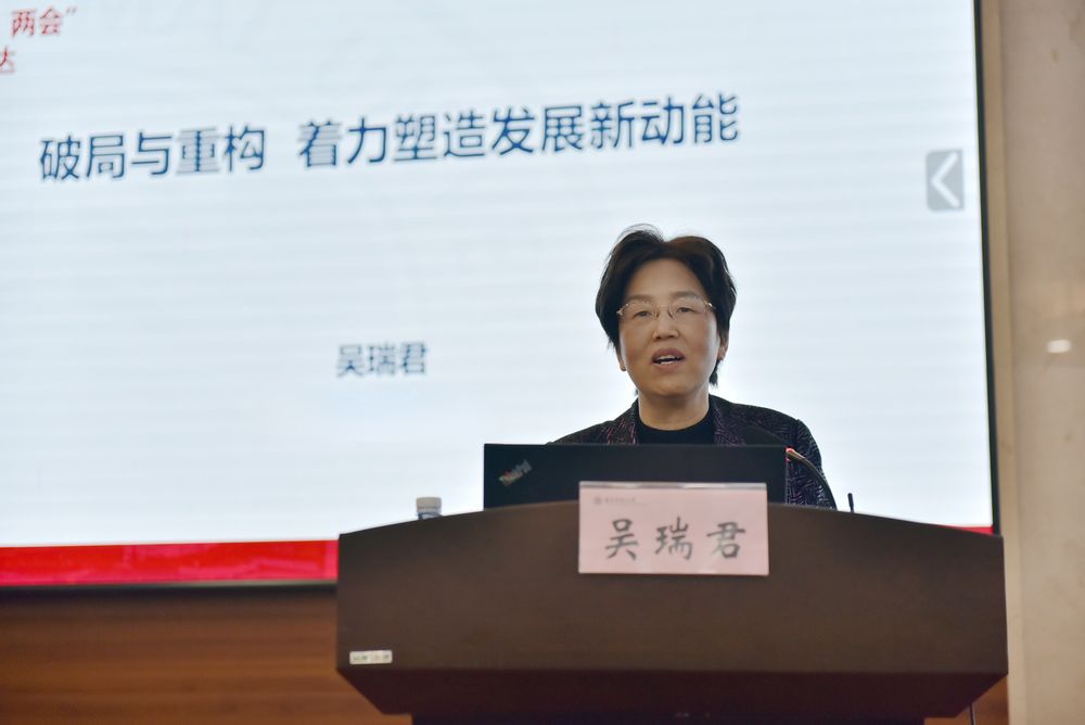 为深入学习和领会2025年全国两会精神内涵,将两会精神与学院实际工作紧密结合,进一步明确发展方向。2025年3月20日,爆料网 党委邀请全国政协委员、上海市政协常委、华东师大学图书馆馆长、华东师大学未来学习发展中心主任、华东师大老龄研究院执行院长吴瑞君教授为全院教师作“破局与重构,着力塑造发展新动能——2025年全国两会精神传达”的专题报告。报告会由院党委书记方媛主持。