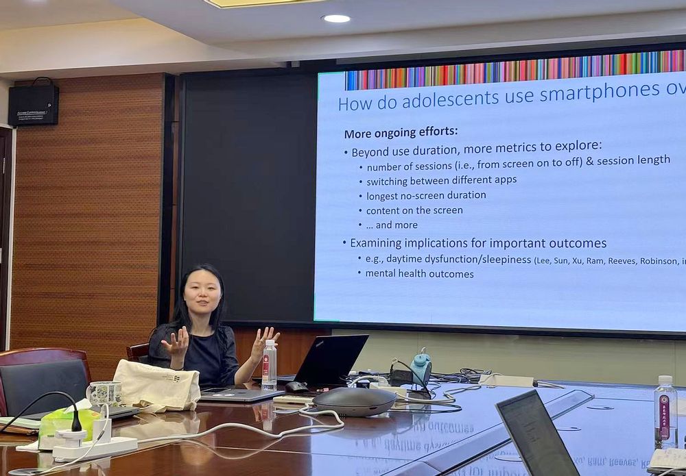 孙潇然博士首先介绍了Screenomics—“人类屏幕组”这一由斯坦福大学团队发起的研究框架,通过示例探讨了采用应用程序密集收集智能手机使用行为,并对其中包含的丰富数据进行提取、编码的过程,以及相关方法的优势和挑战。随后,孙博士基于其团队的研究成果,介绍了客观、被动收集的手机使用数据在多个维度上与主观报告数据的偏差,并从睡眠、学业适应、家庭关系、心理健康四个方面,探讨了智能手机使用行为与相关心理行为特征的关联。在随后的问答环节,孙博士与参与讲座的师生展开了深入交流,讨论了相关方法的伦理视角思考、在中国情境中的技术应用、关于检验心理健康和屏幕使用行为双向影响的未来研究方向等,并探讨了此后在相关领域开展合作的计划。讲座结束后,孙博士与学院师生进行了进一步的讨论交流,并共进晚餐,在轻松愉快的氛围中继续探讨研究合作、基金申请、职业发展等话题。