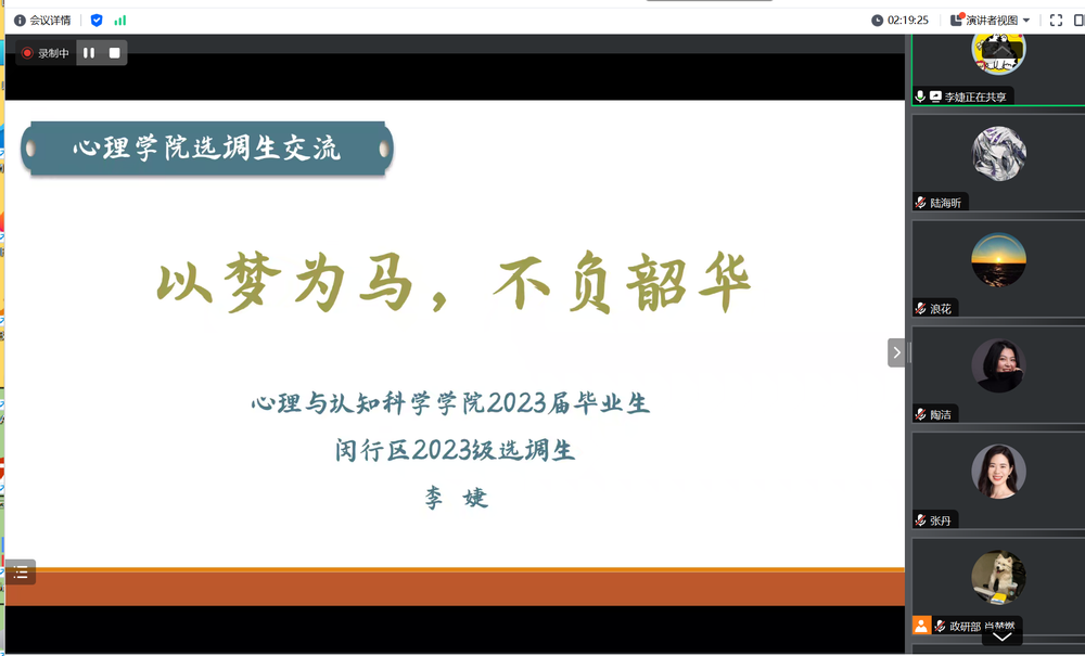 首先,心理学院2024届本科毕业生、2024年浙江省金华市婺城区选调生、现任浙江省金华市婺城区琅琊镇杨塘下村书记助理王珏同学通过线上录制视频的方式为大家介绍了浙江省选调生的类别数量、资格条件、报名程序、笔试面试、初定人选以及后续程序,并向大家分享了浙江省选调生的生活情况、自己入职后的感受等。