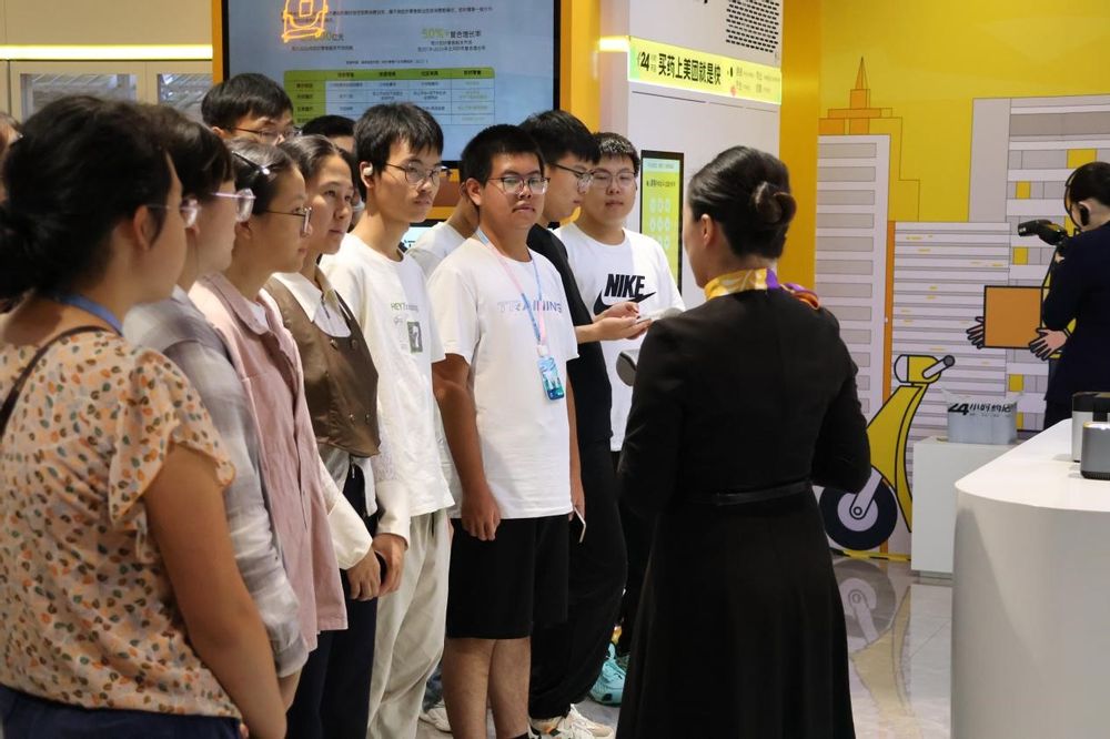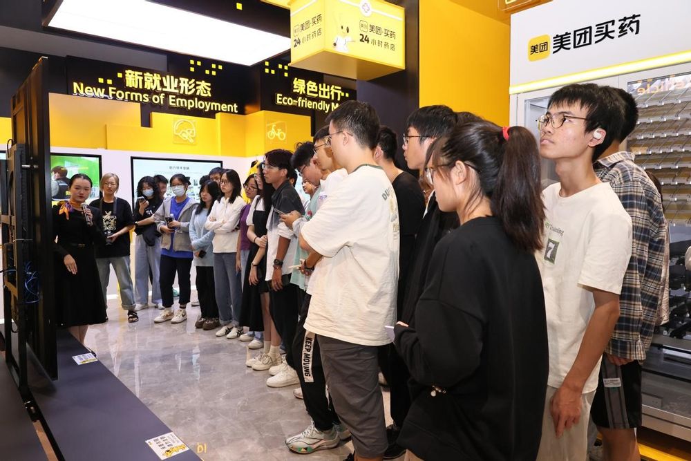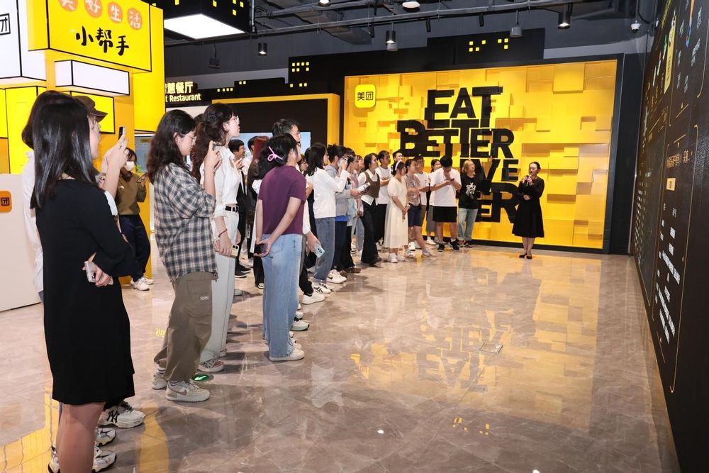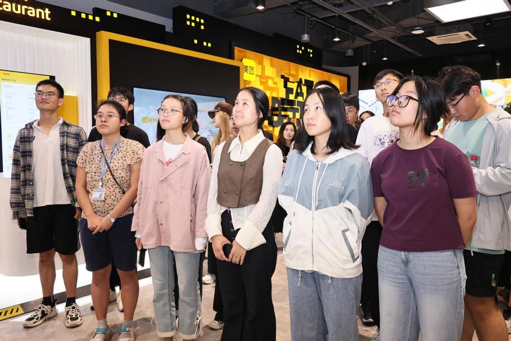 在充满科技感的美团展厅,在工作人员的讲解下,同学们了解了美团从最初的美团网到美团APP的发展历程,从单一的“吃+平台”模式,逐步拓展为“零售+科技”的多元化生态。尤其最新在香港推出的外卖平台Keeta,展现了美团不断突破、勇于创新的企业精神。在大数据展区,通过美团零售大屏的直观展示,同学们被美团大数据在“购、吃、行、娱”等日常生活场景中的广泛应用深深吸引。视频中演示的美团无人机技术在办公、景区、市政公园、医疗、校园等多样化场景的应用,令同学们耳目一新。此外,展区还全面覆盖了美团在智慧餐厅、即时零售、自动驾驶、绿色出行、新就业形态等多个前沿领域的探索与成就。这些丰富的内容不仅拓宽了同学们的视野,也激发了他们对未来科技发展的无限遐想。